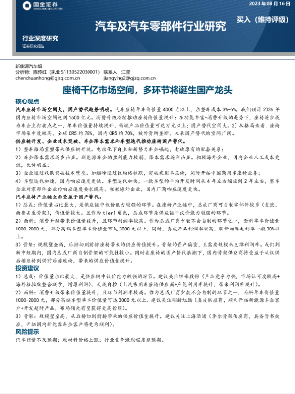 【国金证券】【20230816】汽车及汽车零部件行业研究-座椅千亿市场空间-多环节将诞生国产龙头-21页