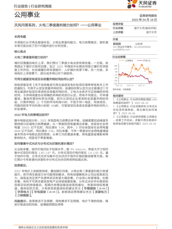 【天风证券】【20220418】公用事业行业天风问答系列:火电二季度盈利能力如何?-16页