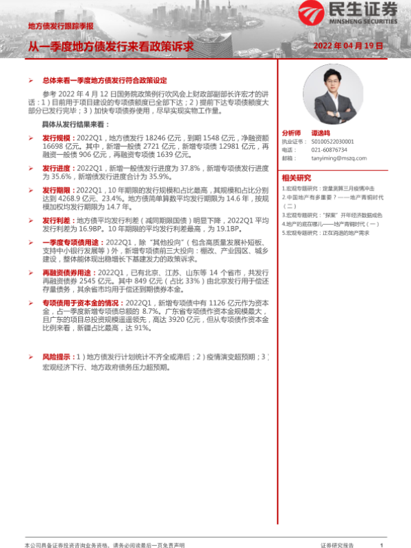 【民生证券】【20220419】地方债发行跟踪季报:从一季度地方债发行来看政策诉求-17页