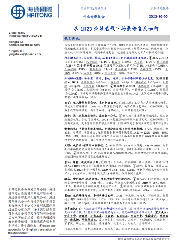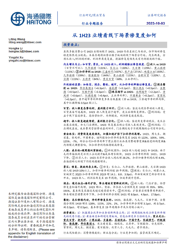 【海通国际】【20231007】从1H23业绩看线下场景修复度如何-15页