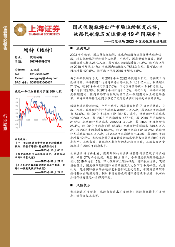 【上海证券】【20231008】交运板块2023年国庆假期数据跟踪-国庆假期旅游出行市场延续恢复态势-铁路民航旅客发送量超19年同期水平-6页