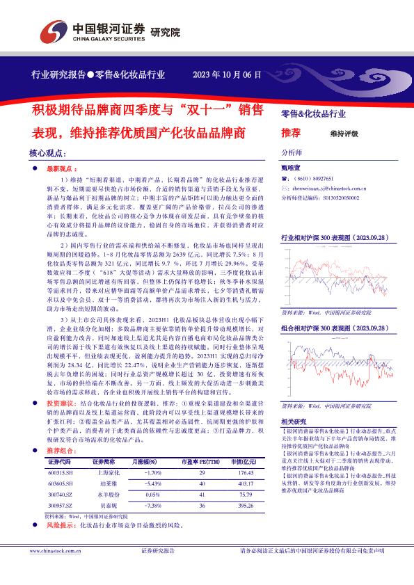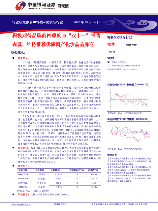 【银河证券】【20231009】零售&化妆品行业-积极期待品牌商四季度与“双十一”销售表现-维持推荐优质国产化妆品品牌商-24页
