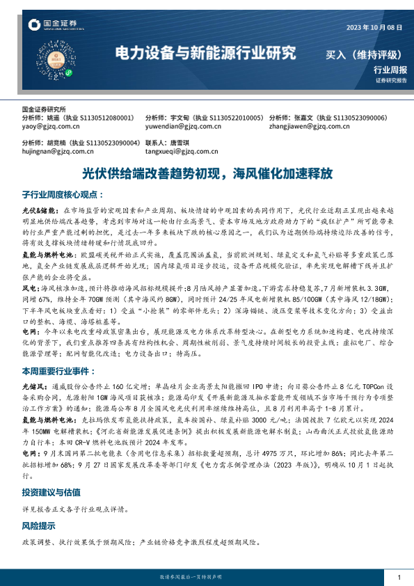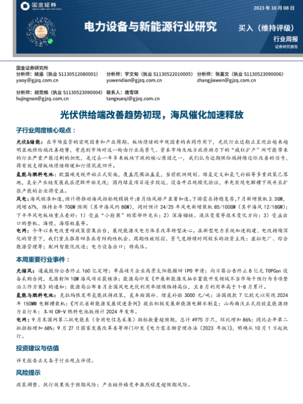 【国金证券】【20231009】2023-10-09-电力设备与新能源行业研究-光伏供给端改善趋势初现-海风催化加速释放-8页