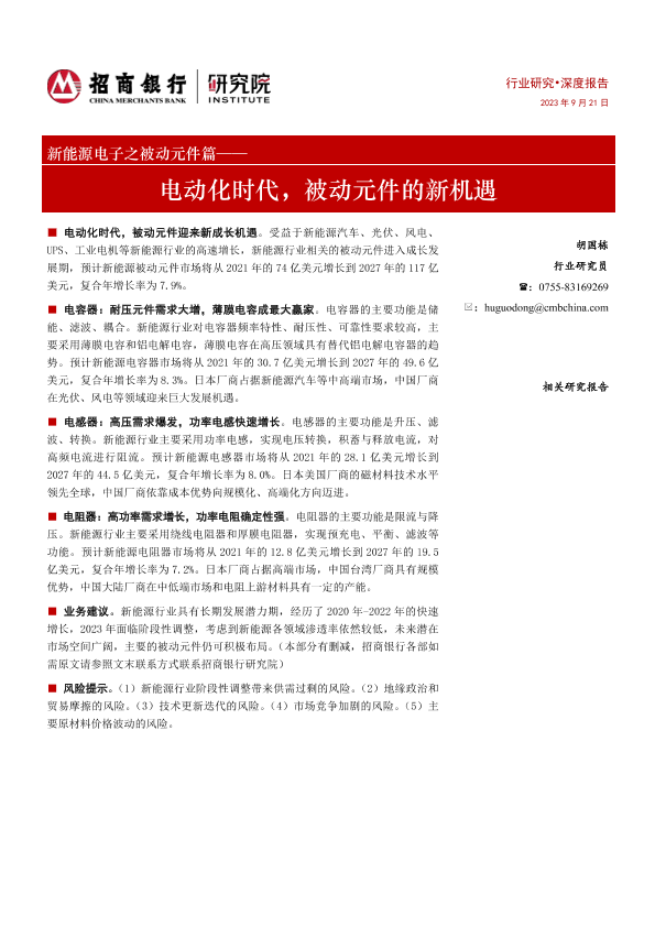 市场分析 招商银行 新能源电子 电动化时代 被动元件