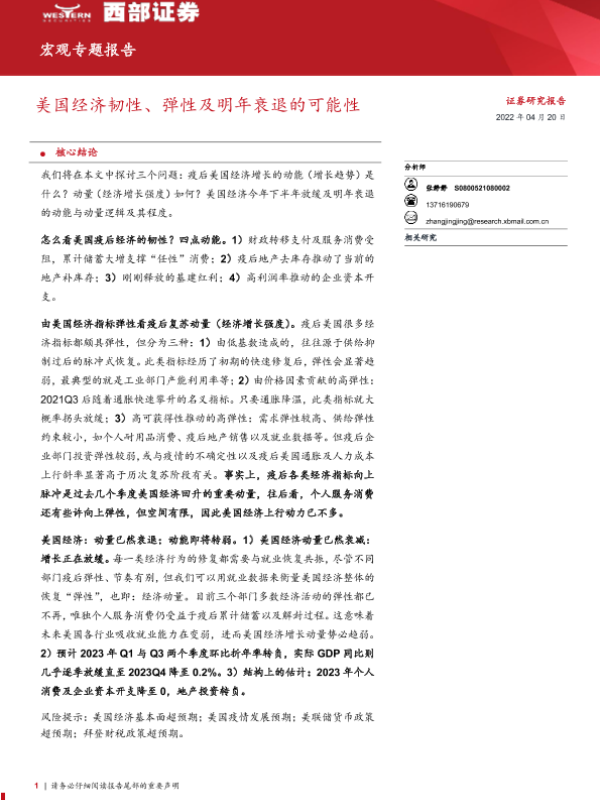 【西部证券】【20220420】宏观专题报告:美国经济韧性、弹性及明年衰退的可能性-19页