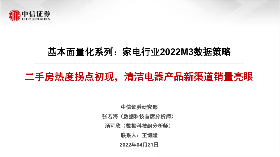 【中信证券】【20220421】家电行业基本面量化系列:家电行业2022M3数据策略,二手房热度拐点初现,清洁电器产品新渠道销量亮眼-22页