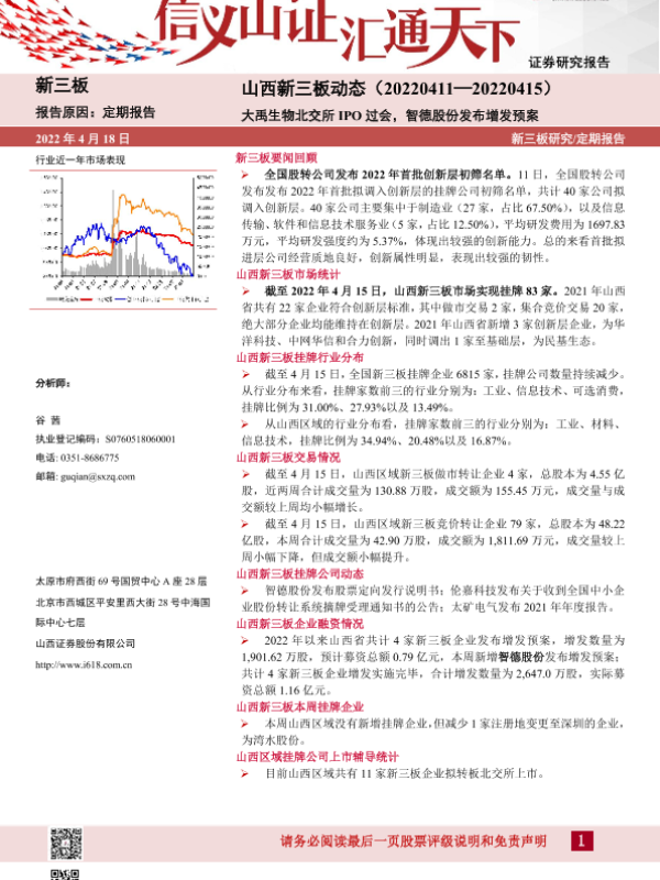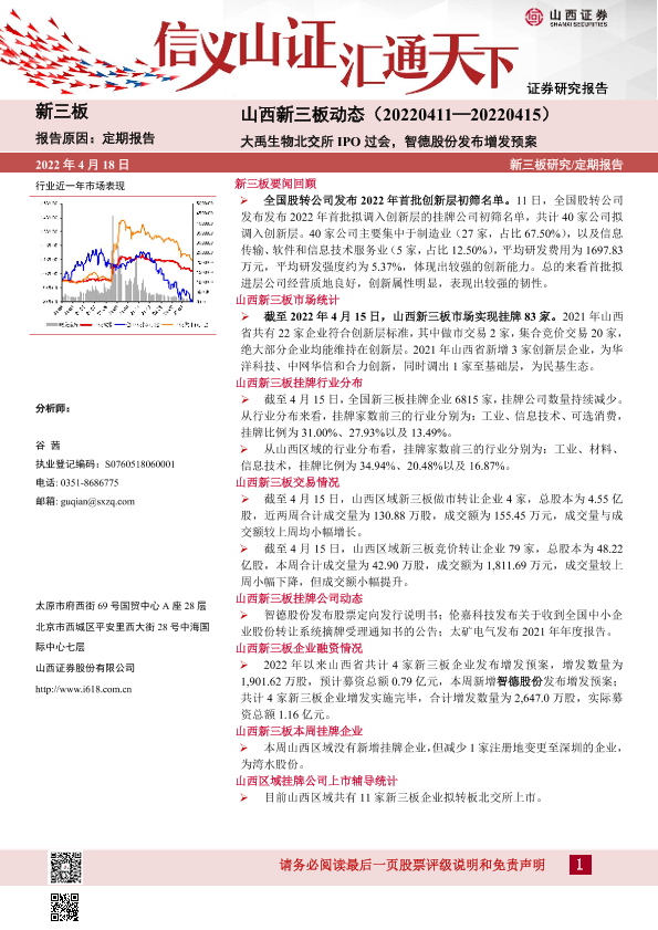 【山西证券】【20220418】山西新三板动态:大禹生物北交所IPO过会,智德股份发布增发预案-15页