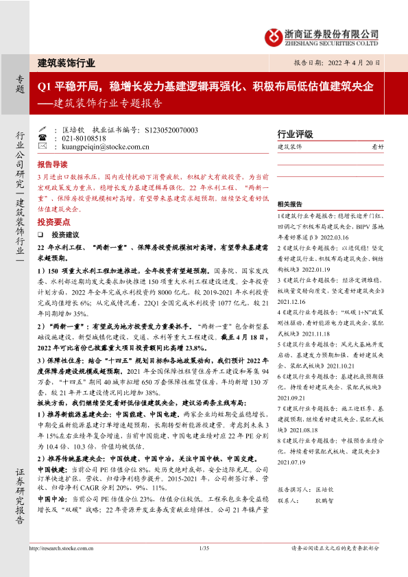 【浙商证券】【20220420】建筑装饰行业专题报告:Q1平稳开局,稳增长发力基建逻辑再强化、积极布局低估值建筑央企-35页