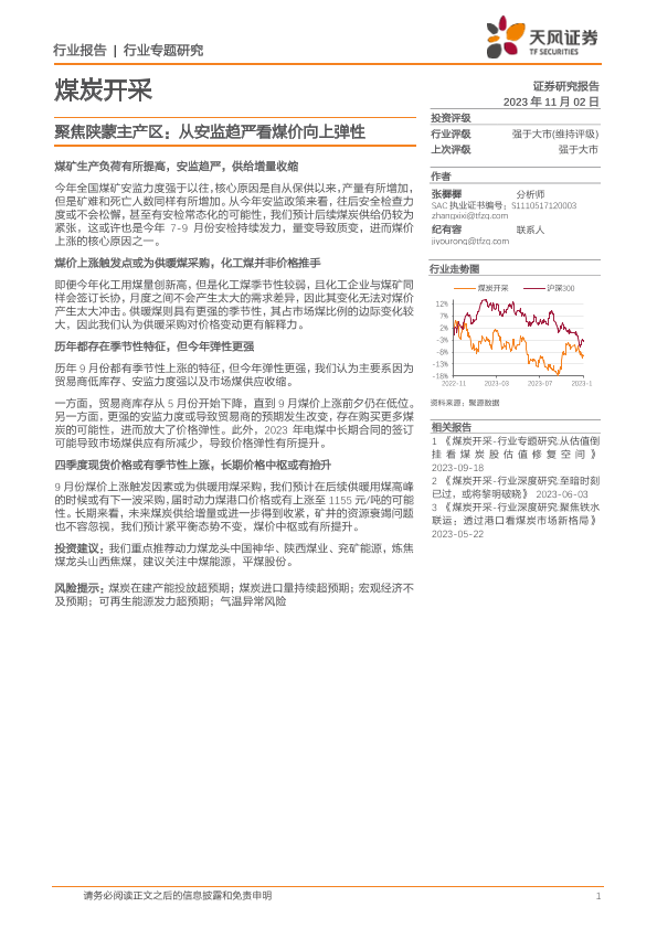 【天风证券】【20231103】2023-11-03-煤炭开采行业专题研究-聚焦陕蒙主产区-从安监趋严看煤价向上弹性-15页