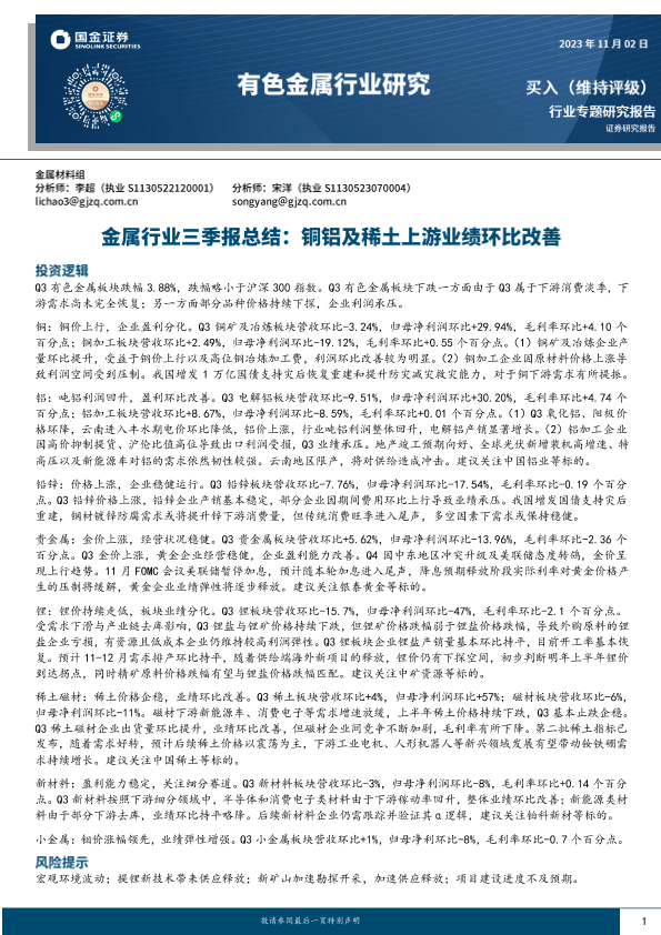 【国金证券】【20231103】2023-11-03-有色金属行业研究-铜铝及稀土上游业绩环比改善-20页