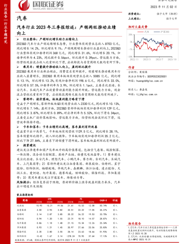 【国联证券】【20231103】汽车行业2023年三季报综述:产销两旺推动业绩向上-31页