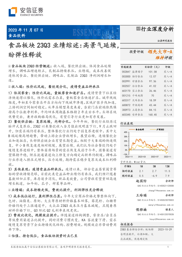 【安信证券】【20231108】食品饮料行业深度分析-食品板块23Q3业绩综述-高景气延续-盼弹性释放-22页