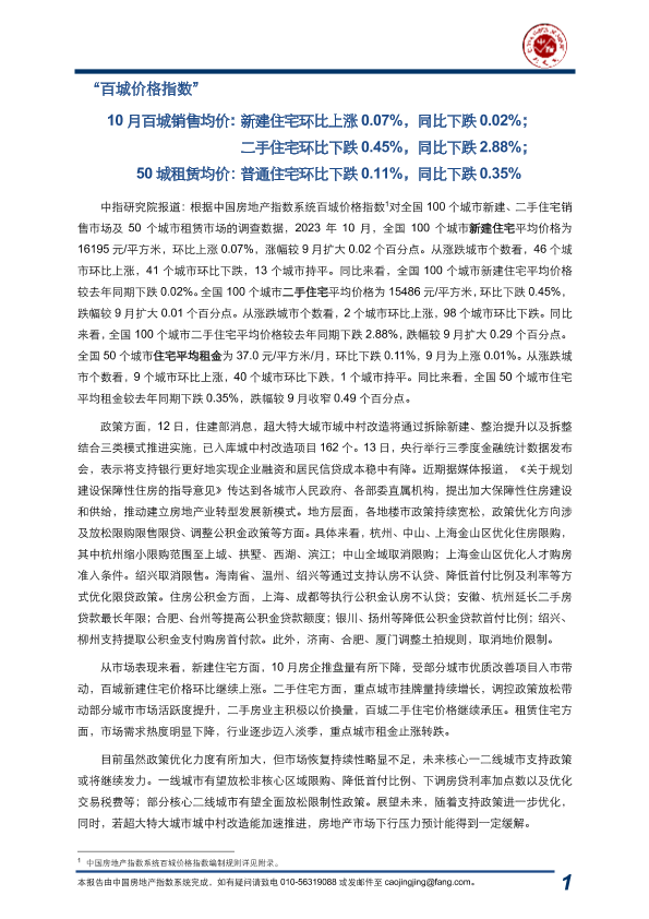 【中指研究院】【20231109】2023-11-09-房地产-“百城价格指数”-17页