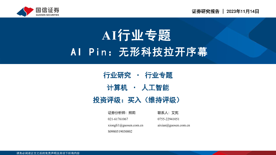 【国信证券】【20231114】AI行业专题-AI Pin-无形科技拉开序幕-13页