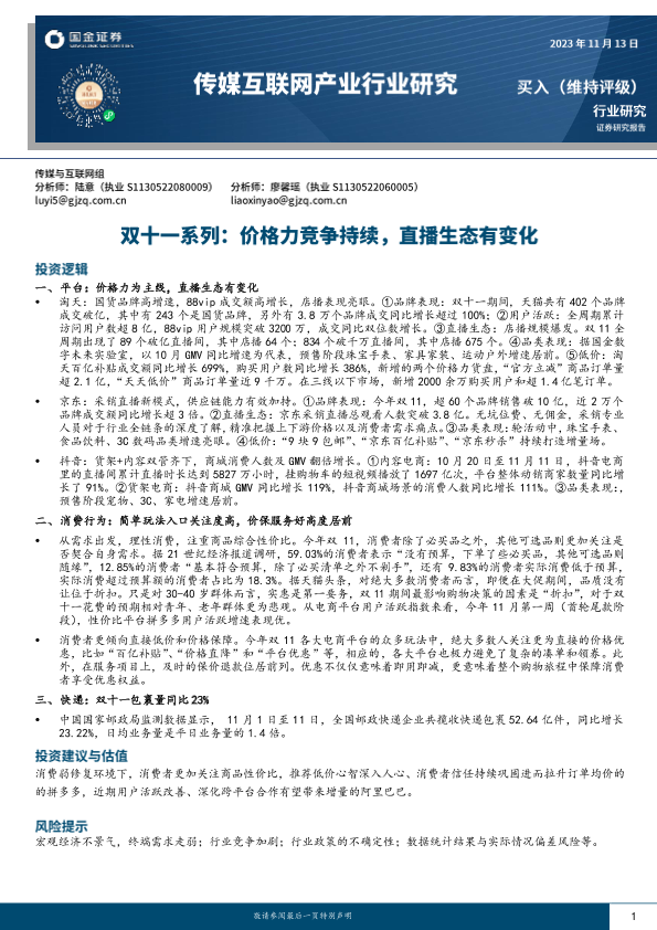 【国金证券】【20231115】2023-11-15-传媒互联网产业行业研究-双十一系列-价格力竞争持续-直播生态有变化-13页