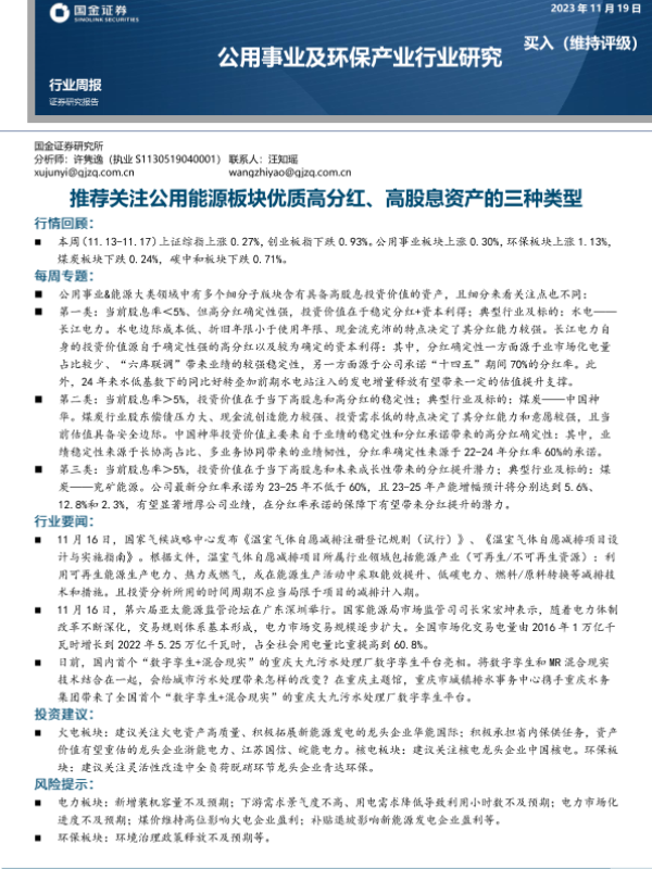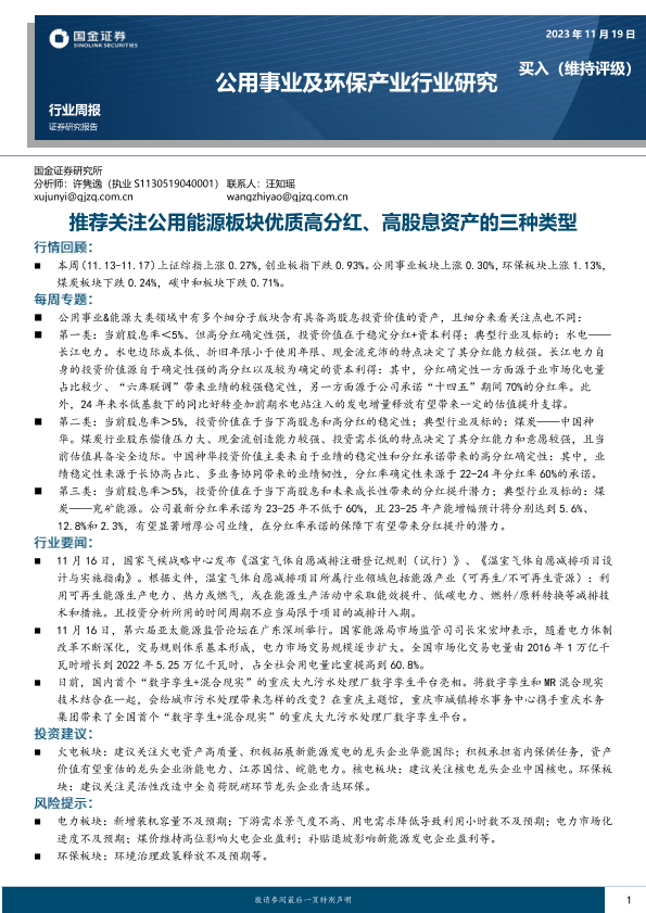 【国金证券】【20231119】2023-11-20-公用事业及环保产业行业研究-推荐关注公用能源板块优质高分红、高股息资产的三种类型-17页