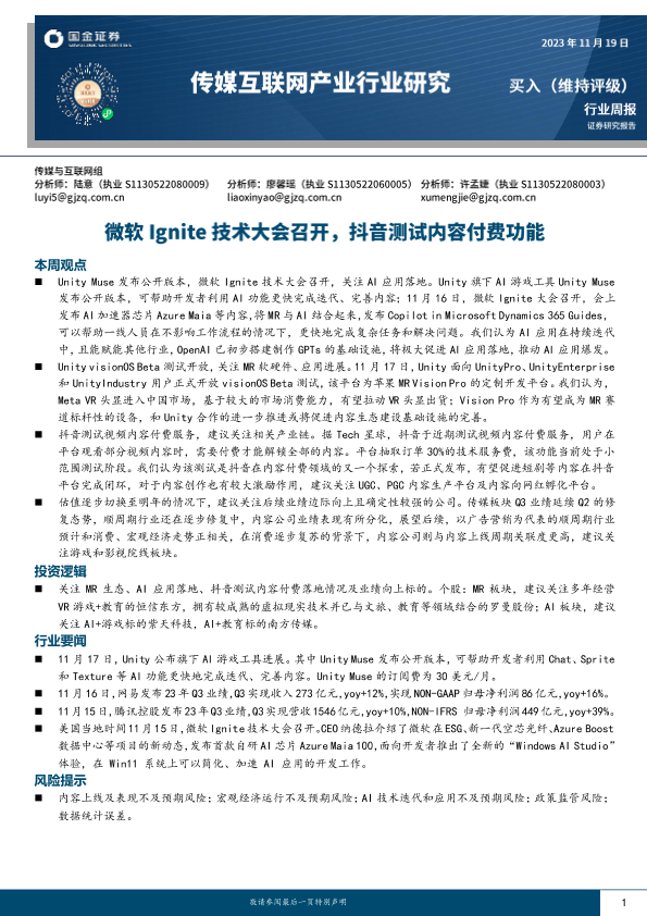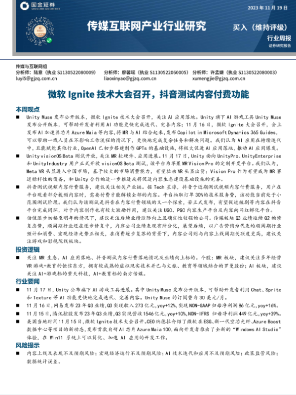 【国金证券】【20231121】2023-11-21-传媒互联网产业行业研究-微软Ignite技术大会召开-抖音测试内容付费功能-20页
