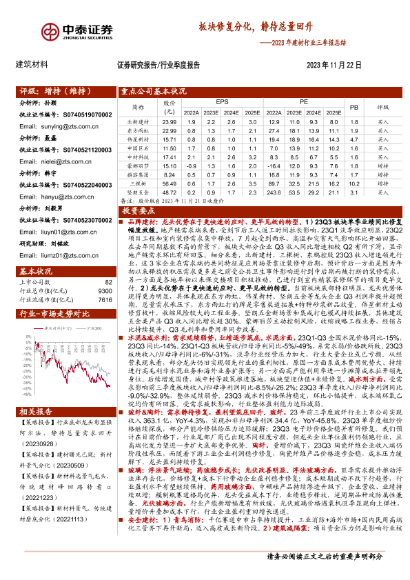 【中泰证券】【20231123】2023年建材行业三季报总结-板块修复分化-静待总量回升-51页