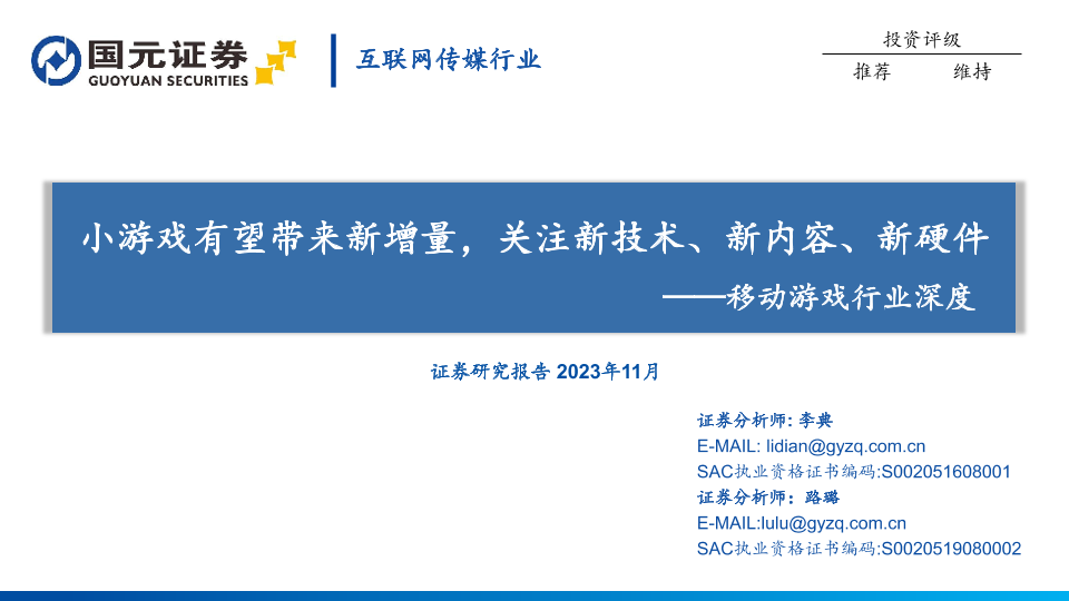 【国元证券】【202311】移动游戏行业深度-小游戏有望带来新增量-关注新技术、新内容、新硬件-57页