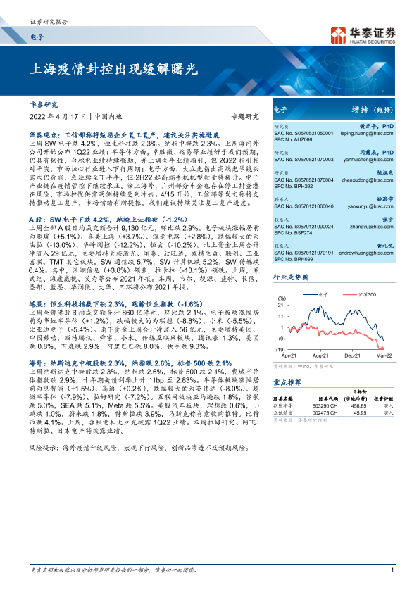 【华泰证券】【20220417】电子行业专题研究:上海疫情封控出现缓解曙光-20页