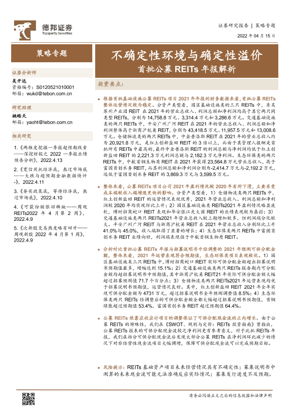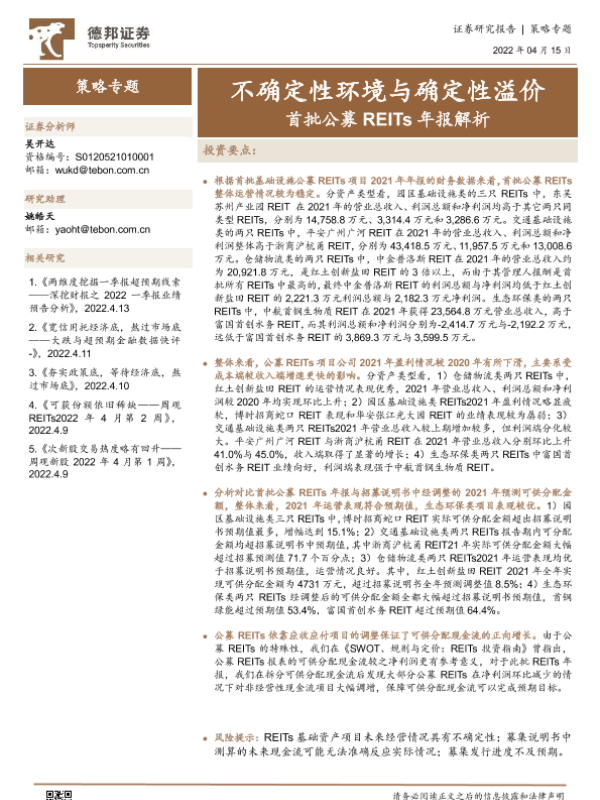 【德邦证券】【20220415】策略专题:首批公募REITs年报解析,不确定性环境与确定性溢价-18页