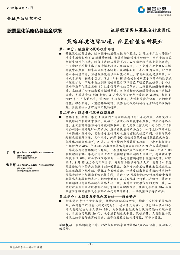 【国金证券】【20220419】股票量化策略私募基金季报:策略环境边际回暖,配置价值有所提升-16页