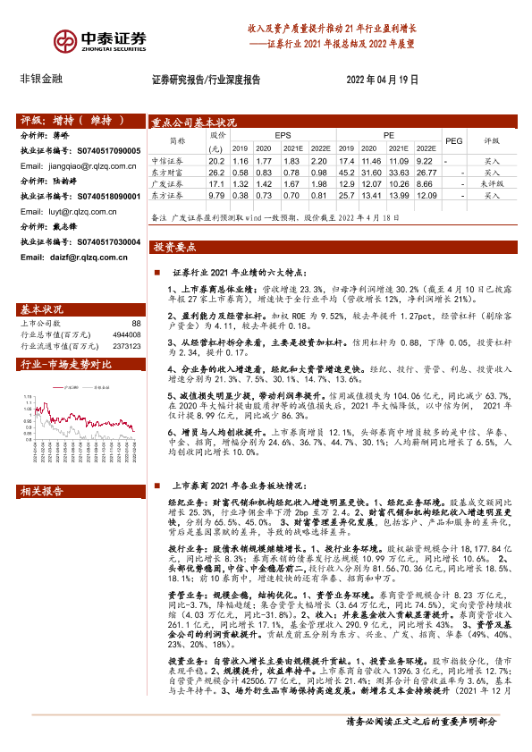 【中泰证券】【20220419】证券行业2021年报总结及2022年展望:收入及资产质量提升推动21年行业盈利增长-31页