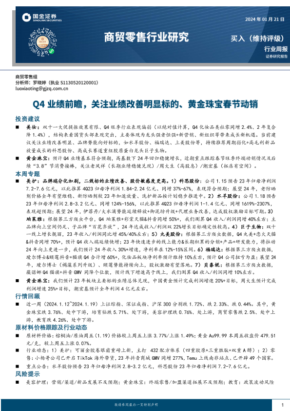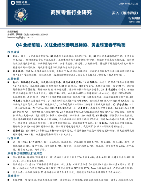 【国金证券】【20240122】2024-01-22-商贸零售行业研究-Q4业绩前瞻-关注业绩改善明显标的、黄金珠宝春节动销-17页