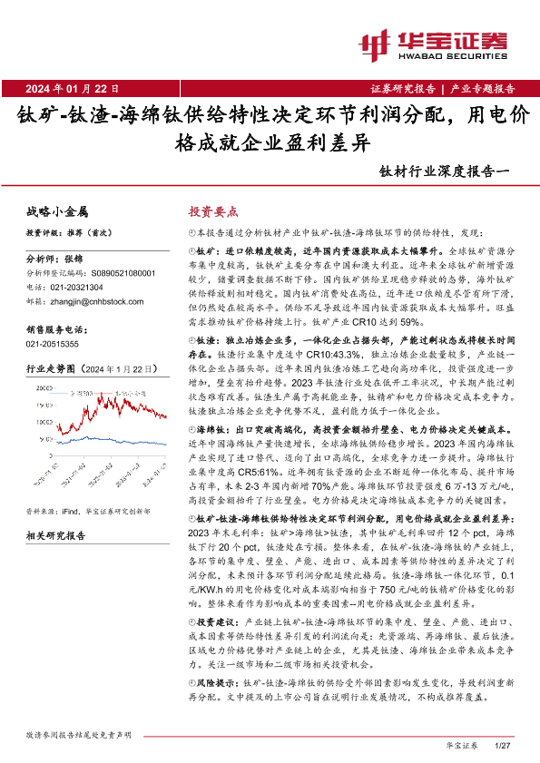 【华宝证券】【20240122】钛材行业深度报告一-钛矿-钛渣-海绵钛供给特性决定环节利润分配-用电价格成就企业盈利差异-27页