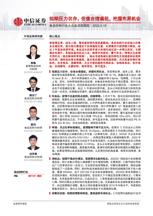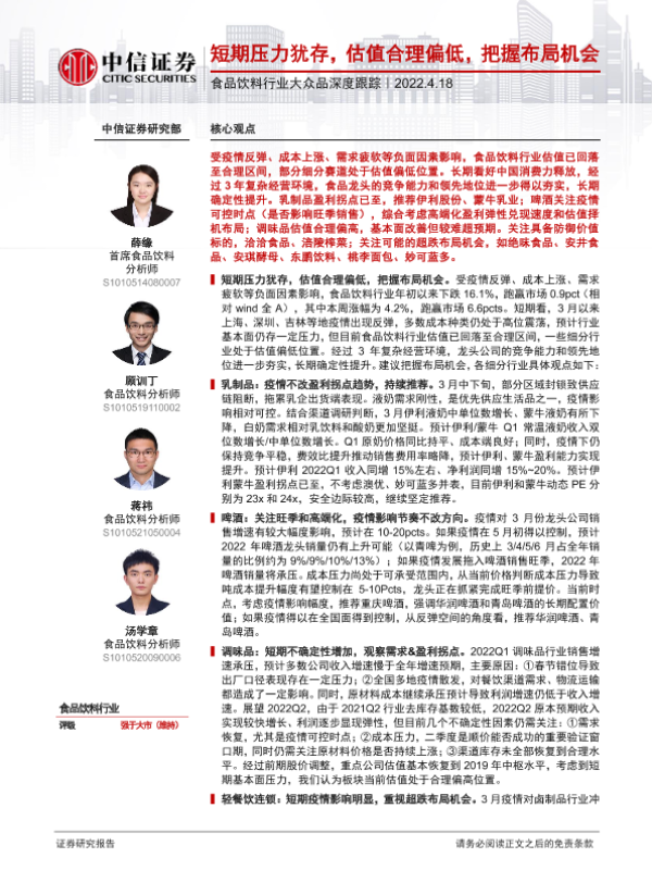 【中信证券】【20220418】食品饮料行业大众品深度跟踪:短期压力犹存,估值合理偏低,把握布局机会-31页