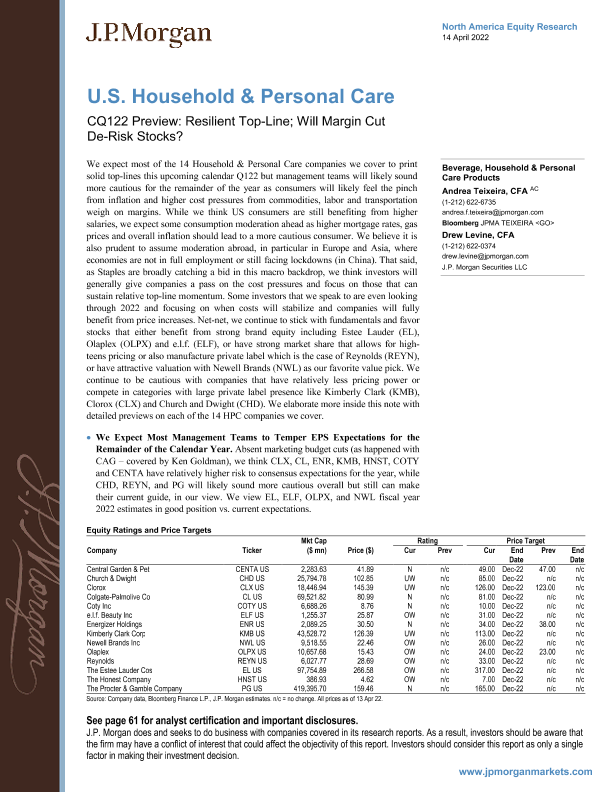 【J.P. Morgan】【20220414】美股家庭和个人护理行业-CQ122预览:弹性顶线;保证金会降低股票的风险吗-65页