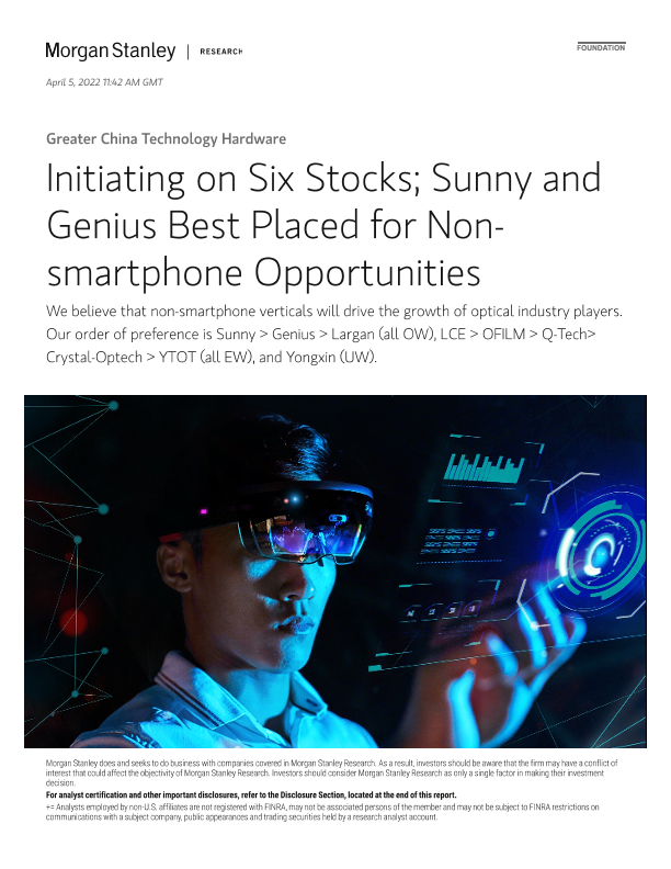 【Morgan Stanley】【20220405】摩根士丹利-中国科技硬件行业-启动六只股票;Sunny和Genius最有可能获得非智能手机领域的机遇-83页