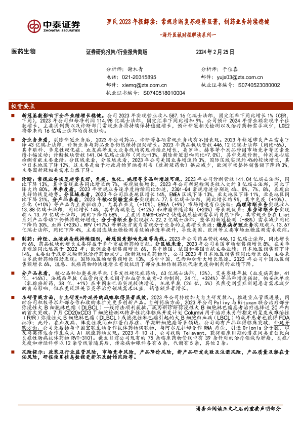 【中泰证券】【20240225】2024-02-26-海外医械财报解读系列一-罗氏2023年报解读-常规诊断复苏趋势显著-制药业务持续稳健-9页