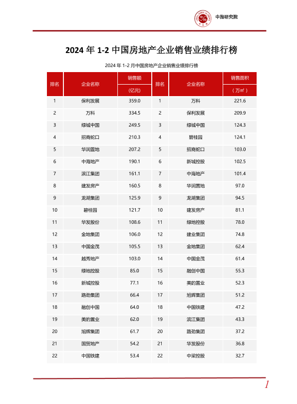 1-2月 2024年 中国指数研究院 房地产销售 排行榜