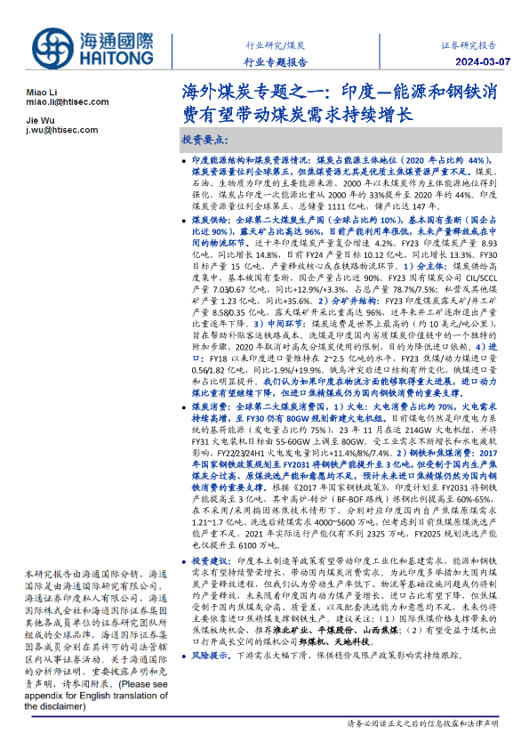 【海通国际】【20240307】海外煤炭专题之一-印度—能源和钢铁消费有望带动煤炭需求持续增长-39页