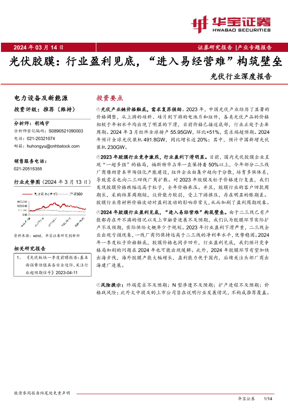 【华宝证券】【20240315】2024-03-15-光伏行业深度报告-光伏胶膜-行业盈利见底-“进入易经营难”构筑壁垒-14页