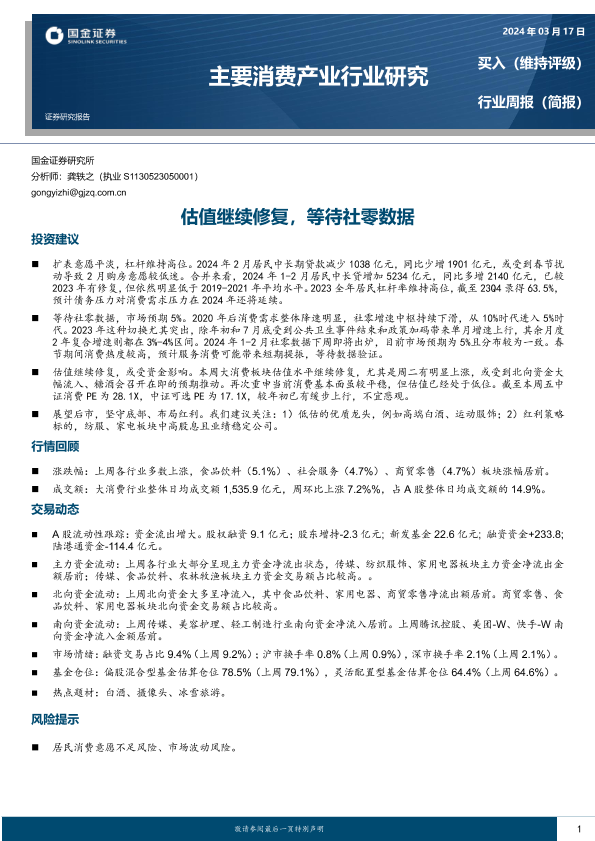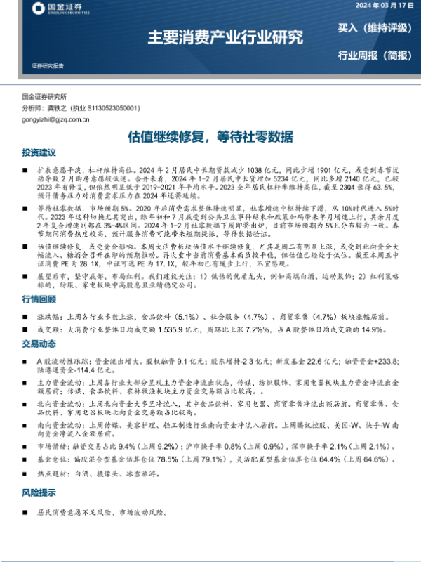 【国金证券】【20240317】2024-03-18-主要消费产业行业研究-估值继续修复-等待社零数据-18页