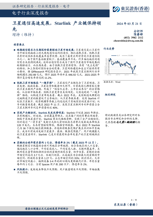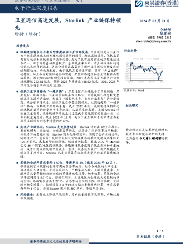 【东吴证券(香港)】【20240322】2024-03-22-电子行业深度报告-卫星通信高速发展-Starlink产业链保持领先-5页