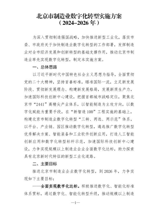 制造业数字化 北京市 实施方案 数字化转型 智能制造