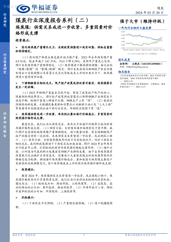 【华福证券】【20240320】煤炭行业深度报告系列(二)-炼焦煤-供需关系或进一步收紧-多重因素对价格形成支撑-20页