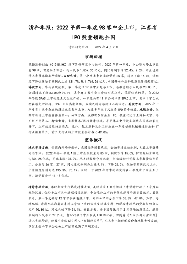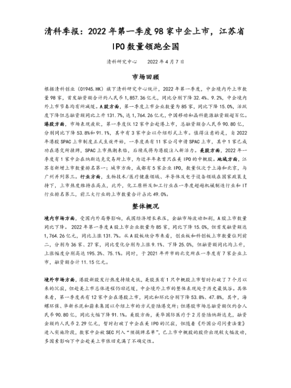 【清科研究中心】【20220407】清科季报:2022年第一季度98家中企上市,江苏省IPO数量领跑全国-8页