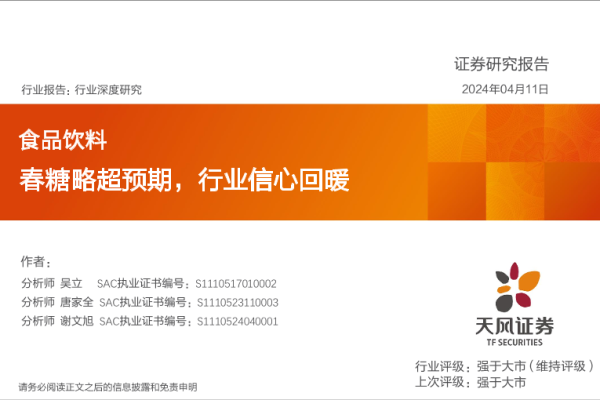【天风证券】【20240411】2024-04-12-食品饮料行业深度研究-春糖略超预期-行业信心回暖-22页