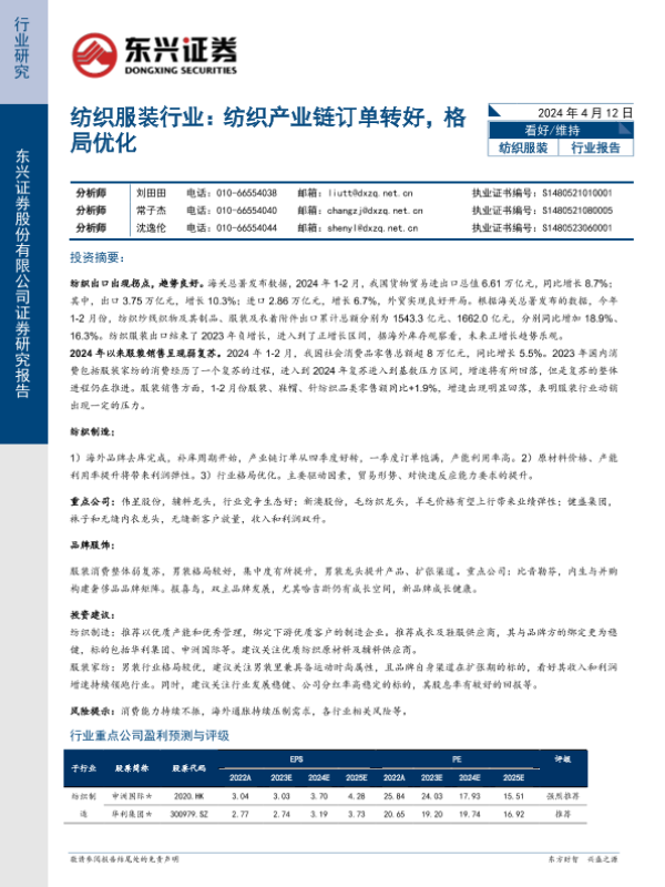 【东兴证券】【20240412】纺织服装行业:纺织产业链订单转好,格局优化-12页