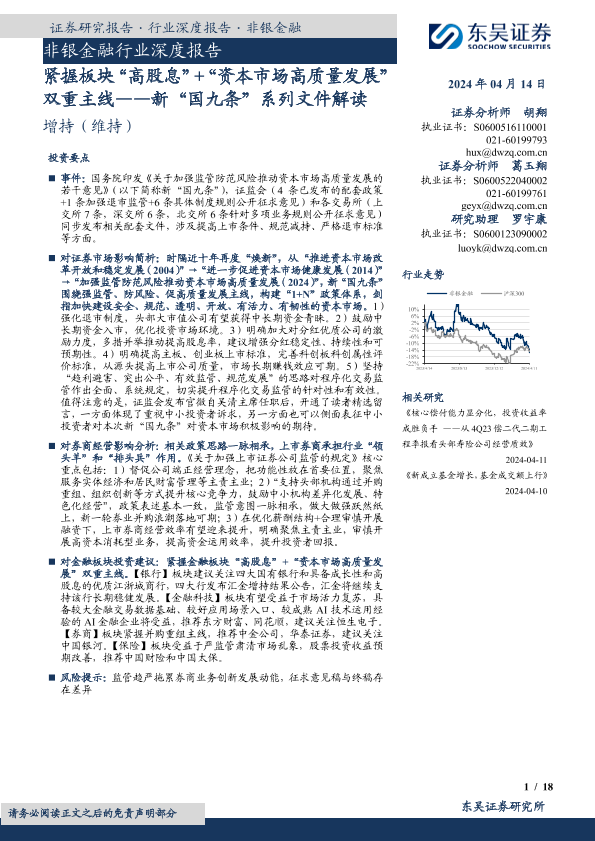 【东吴证券】【20240415】非银金融行业深度报告-新“国九条”系列文件解读-紧握板块“高股息”+“资本市场高质量发展”双重主线-18页