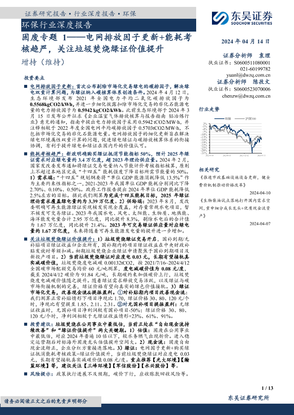 【东吴证券】【20240414】环保行业深度报告-固废专题1——电网排放因子更新+能耗考核趋严-关注垃圾焚烧绿证价值提升-13页