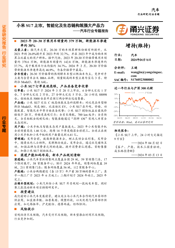 【甬兴证券】【20240417】2024-04-17-汽车行业专题报告-小米SU7上市-智能化及生态链构筑强大产品力-22页