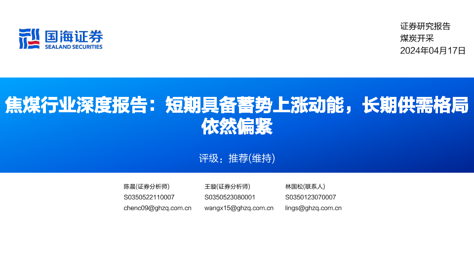【国海证券】【20240418】焦煤行业深度报告 短期具备蓄势上涨动能, 长期供需格局依然偏紧-41页