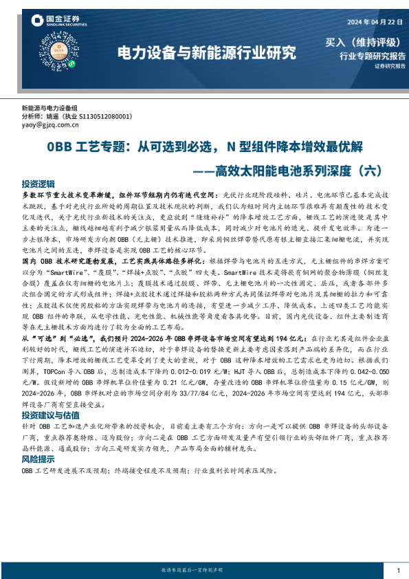【国金证券】【20240423】电力设备与新能源行业研究-高效太阳能电池系列深度(六)-0BB工艺专题-从可选到必选-N型组件降本增效最优解-24页