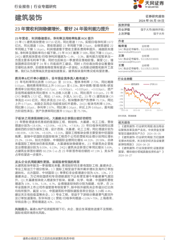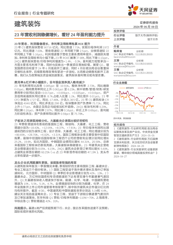 【天风证券】【20240509】2024-05-10-建筑装饰行业专题研究-23年营收利润稳健增长-看好24年盈利能力提升-26页