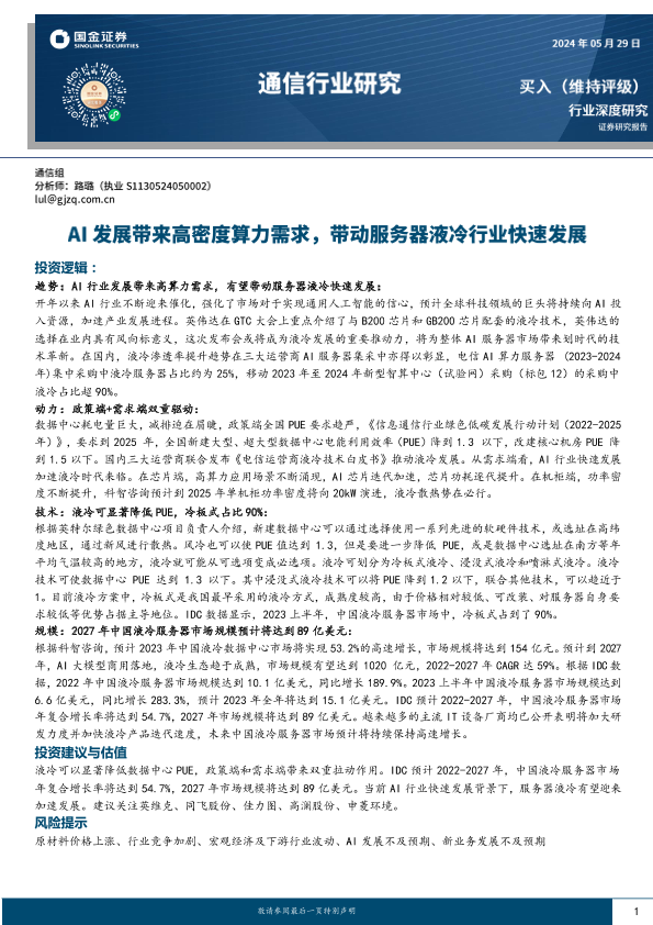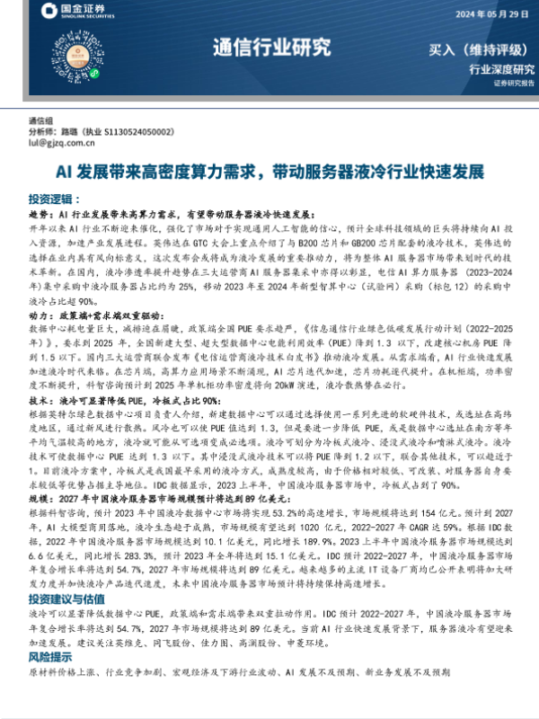 【国金证券】【20240530】通信行业研究-AI发展带来高密度算力需求-带动服务器液冷行业快速发展-20页